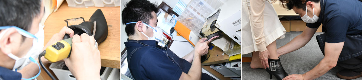 お持ちの靴を調整・改造し、既成靴を履く方の足にできる限り合わせるサービスになります。例えば靴が脱げる感じがある・歩いていると指が痛くなる・今の靴だと歩きづらい感じがするといった問題は、既成靴と足が合っていない場合に発生してしまうトラブルで、これはインソールでは解決できない事なんです。