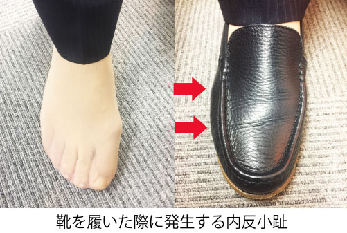これは靴内で「踵の向きと、爪先の向きが異なる」事で小指が靴の壁にぶつかり、小指の内側への変形を増悪させ「内反小趾」が起こる状態です。