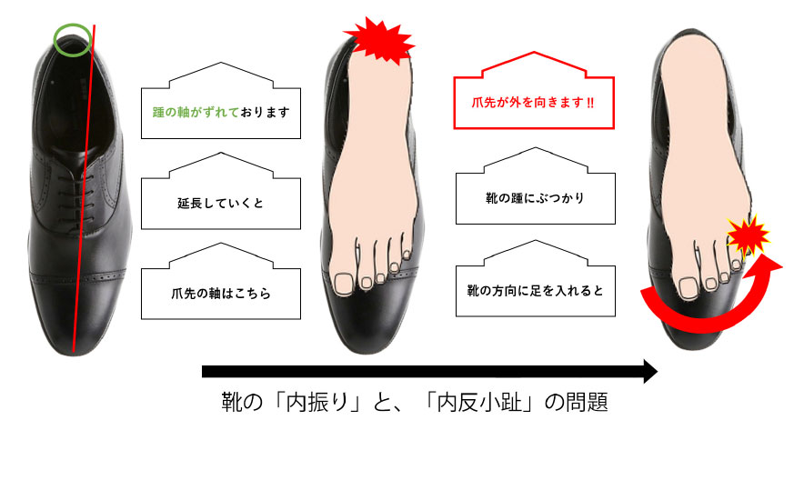 近年における既成靴には「内振り」という、靴自体が真ん中から先端にかけて内側に曲がっている問題があります。